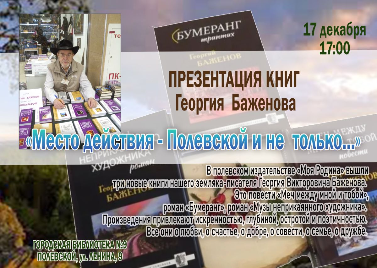 На днях в полевском издательстве «Моя Родина» вышли три новые книги нашего земляка-писателя Георгия Викторовича Баженова. Презентация книг состоится 17 декабря, в 5 часов, в Городской библиотеке № 9. Стоимость одной книги 400 рублей.