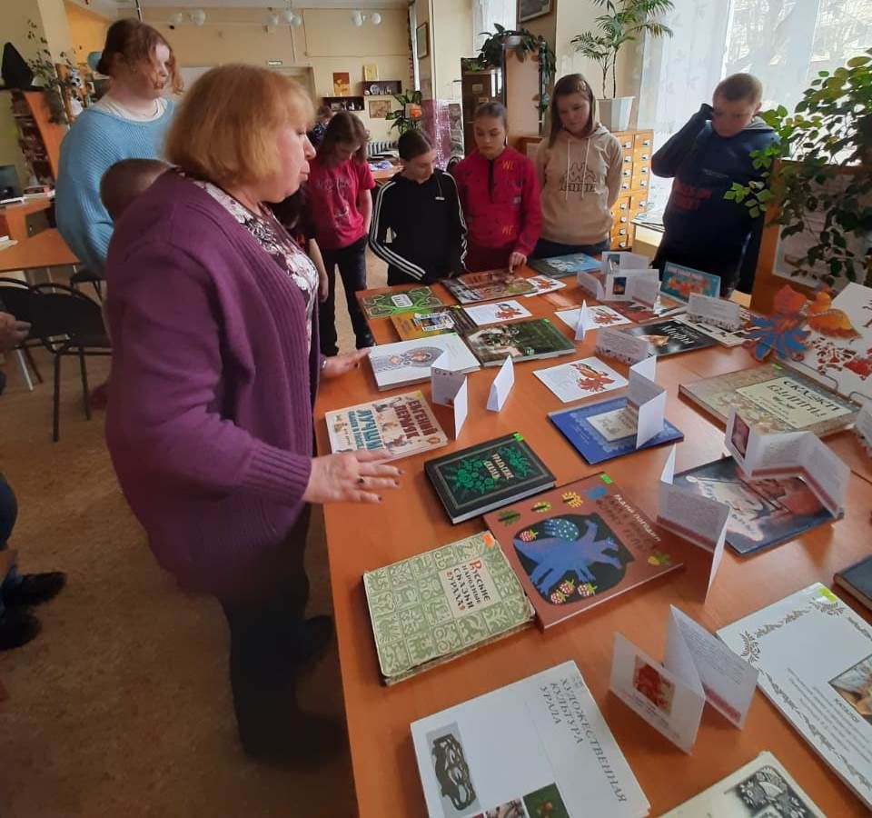 Библиограф Городской библиотеки №9, Кузнецова Марина Генриховна, для ребят коррекционной школы провела обзор книг выездной книжной выставки «Это все наше, Российское» из Свердловской областной библиотеки для детей и молодёжи имени В. П. Крапивина.