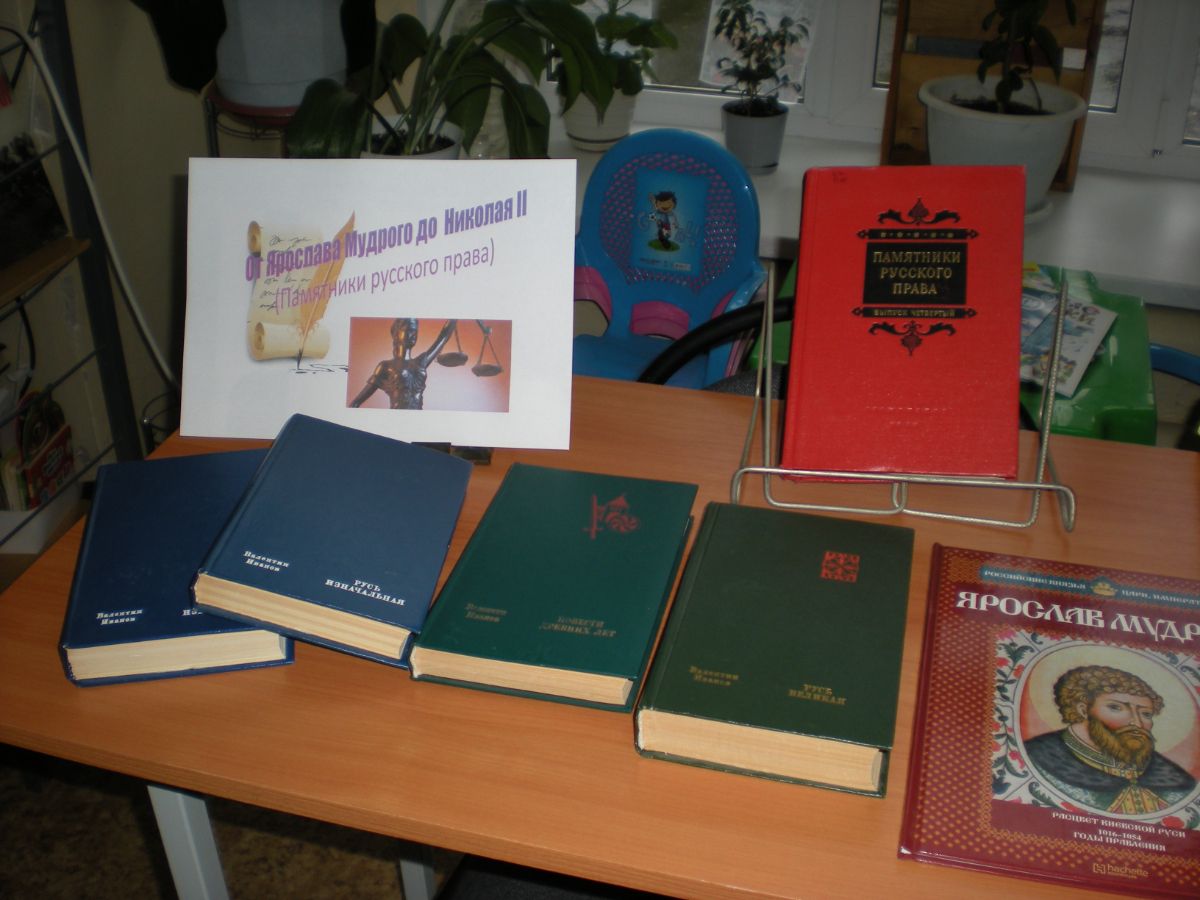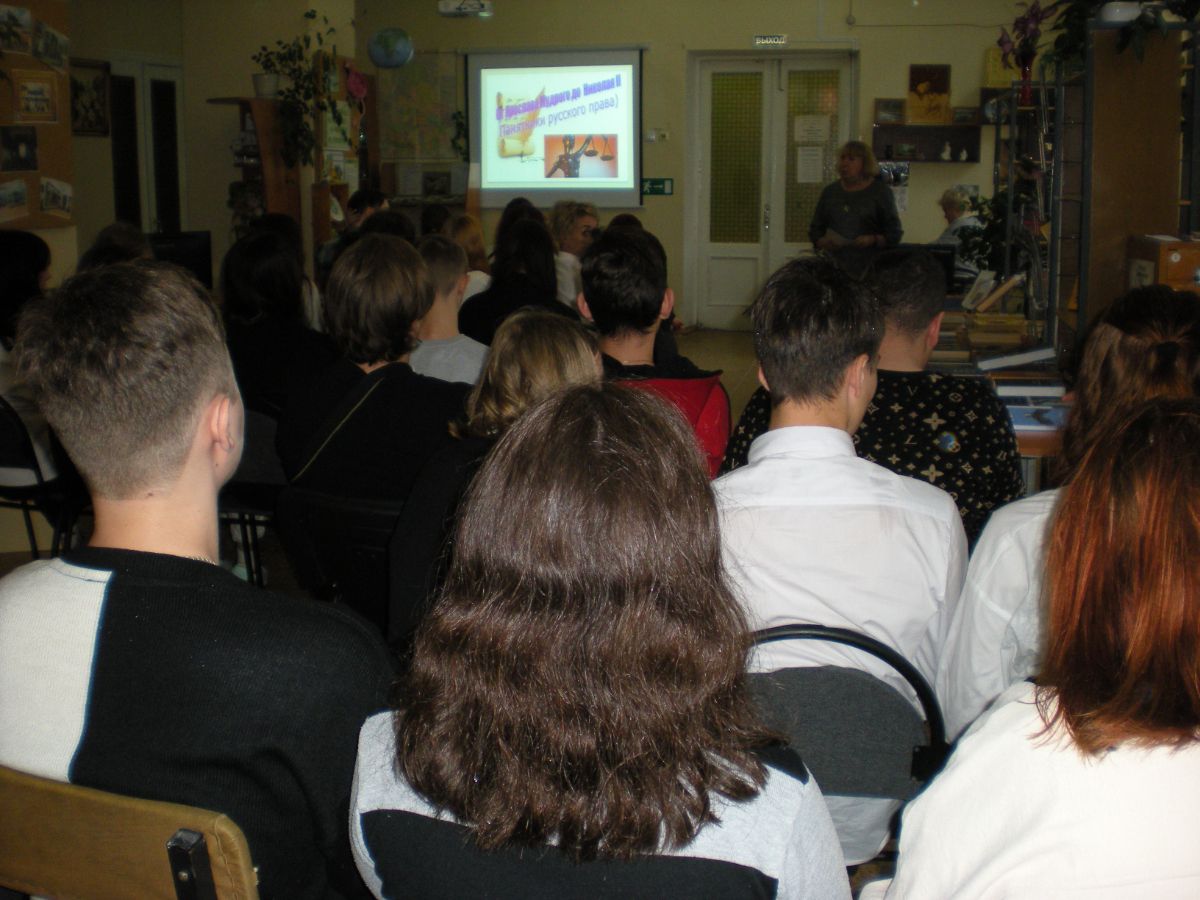 В ходе познавательного мероприятия, сопровождающего выставку, студенты колледжа экономики и права узнали о главном древнерусском источнике права – Русской правде, а так же проследили развитие права в книгах «Русь изначальная», «Повесть временных лет», «Русь Великая». Узнали о великом князе Иване Третьем, который в 1497 году утвердил единый для всей Руси сборник законов. А так же о Петре I, Екатерине II, Александре II и Николае II, которые развили и доработали судебную систему и собрание законов Российской империи. Что так же нашло отражение в исторических романах, представленных на выставке в читальном зале.