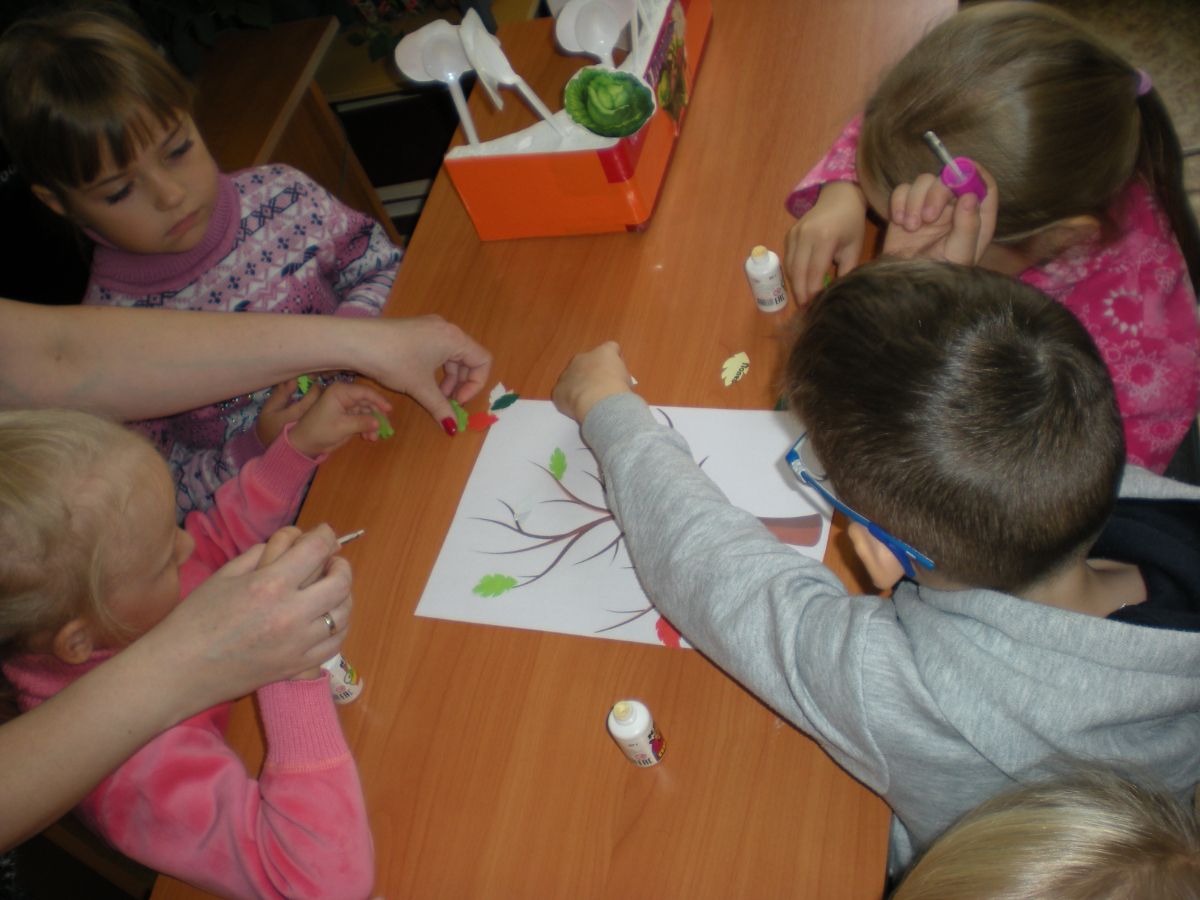 Затем все вместе наряжали дерево в осенние листочки.