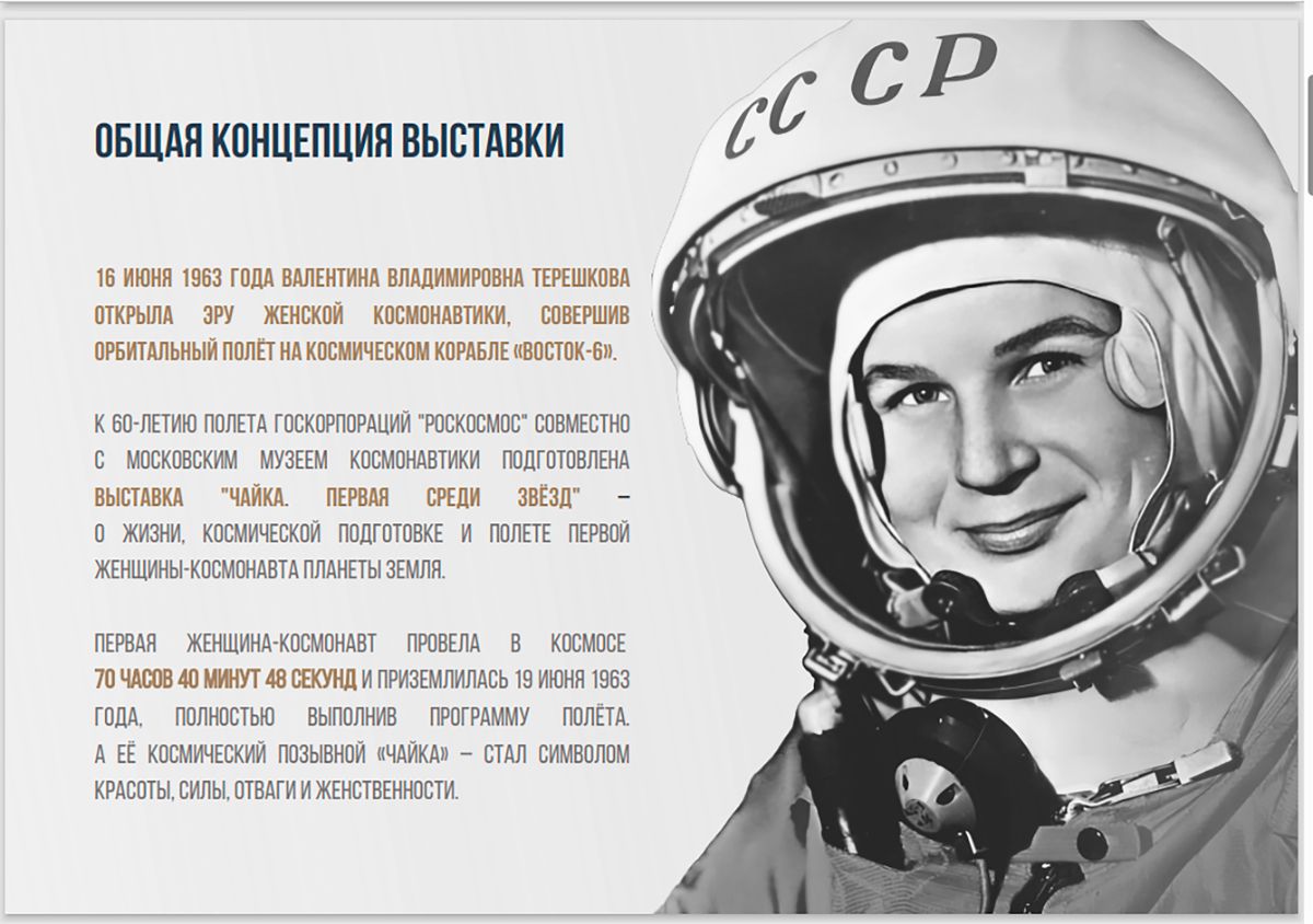 ГК «Роскосмос К 60-летию полета» совместно с Московским музеем космонавтики подготовлена выставка «Космический взлёт «Чайки» - о жизни, космической подготовке и полете первой женщины-космонавта планеты Земля.