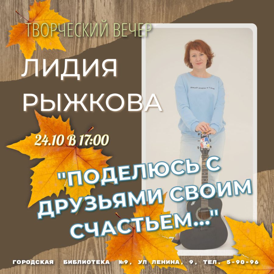 Приглашаем вас на творческую встречу с Лидией Рыжковой! Это прекрасная возможность познакомиться поближе с этой солнечной поэтессой и зарядиться той самой положительной энергией, которую она так щедро дарит всем вокруг.