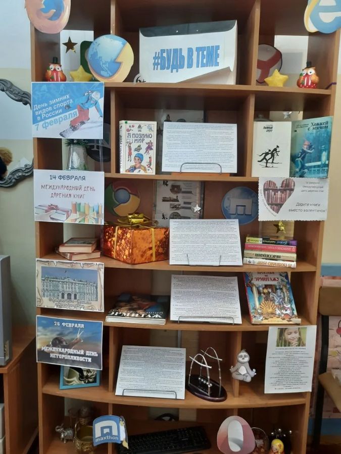 Особое внимание было уделено тематическим экспозициям в отделе ЦОД. Здесь посетители могли познакомиться с выставкой «Будь в теме!», которая раскрывала любопытные факты о таких днях, как День зимних видов спорта в России, День дарения книг, годовщина открытия Эрмитажа для публики и Международный день неторопливости.